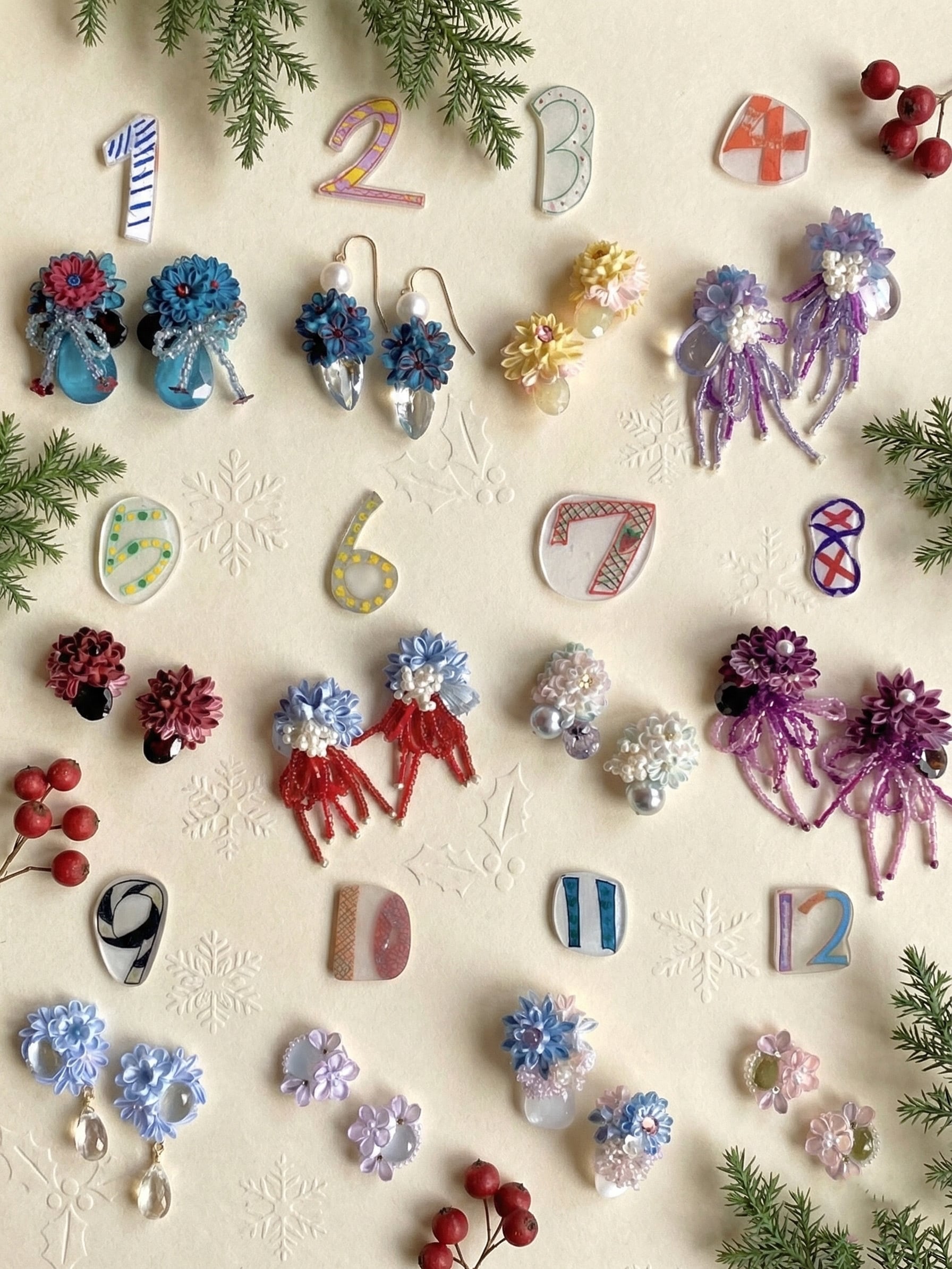 2025年 アドベント企画作品 【12月22日】笑顔になる花 色とりどりのつまみ細工のお花を集めた、 見ているだけで心がぱっと明るくなるイヤーアクセサリー。 小さな花畑の中を、 蝶々がひらひらと舞っているようなデザインです。 本作品は kumakumao アドベント企画として、 12月1日〜24日まで毎日ご紹介している作品のひとつです。 12月25日 21:00より、BASEショップにて一斉販売いたします。 ⸻ ■ カラー/サイズ ・カラー:カラフル ・サイズ:全体サイズ 約mm ⸻ ■ 素材 ・つまみ細工(絹布) ・アクリル樹脂 ・天然石アイオライト ・ビーズ (製造国:日本) ⸻ ■ ご購入前に ※すべて手作業で制作しているため、色味や形に個体差がございます。 ※写真と実物で若干色味が異なる場合がございます。 ※水濡れや強い衝撃はお避けください。 ※天然石は内包物やクラックがあるものを、パールはくぼみや縞のあるものを使用しております。 ⸻ ■ 発送について ・ご注文から発送まで、約1週間から10日ほど日にちをいただきます。 ・年末年始を挟む場合、配送状況によりお届けまでお日にちを要することがございます。