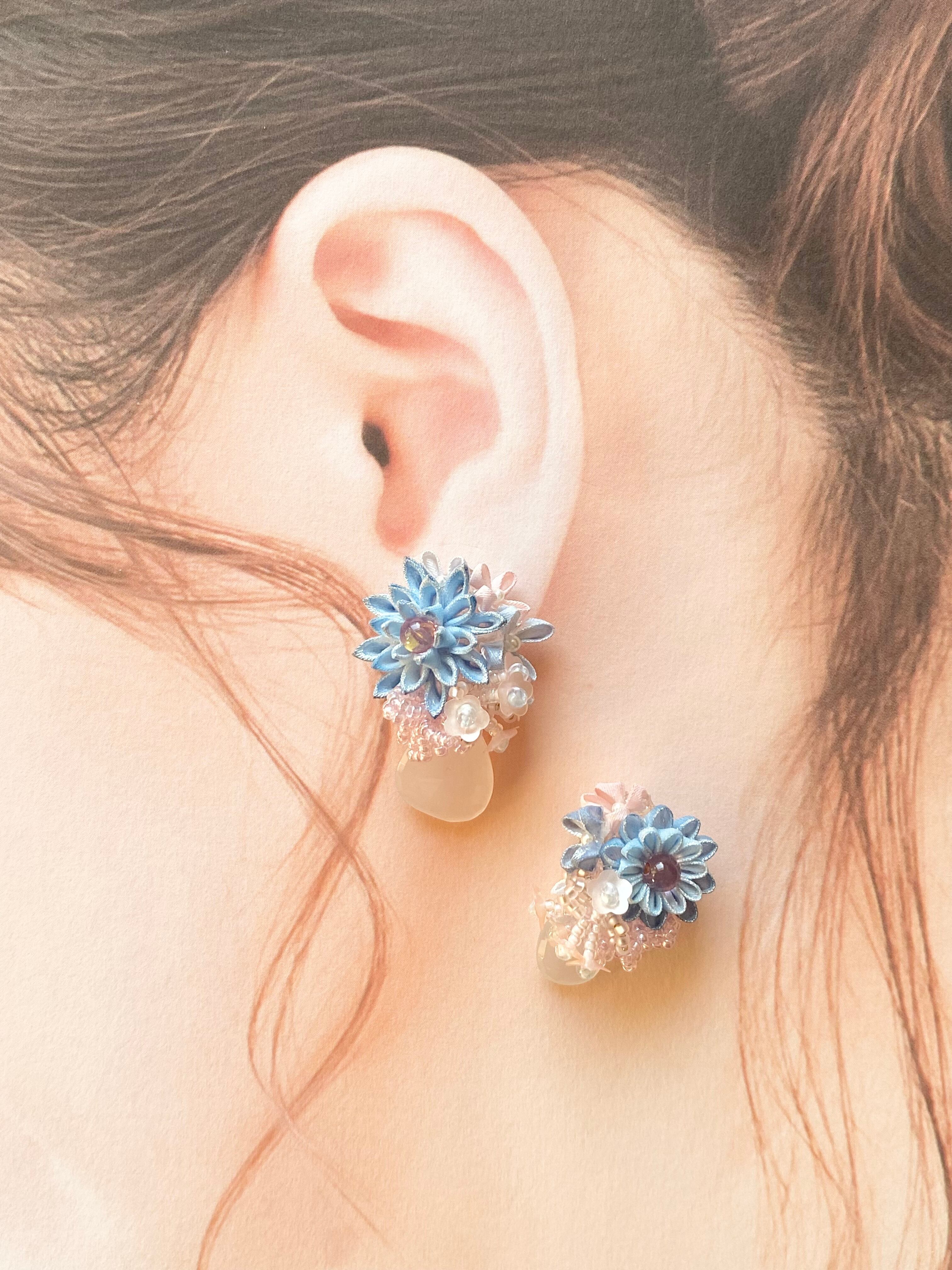 「大人可愛い」アイスブルーのお花の耳飾りに仕立てました。